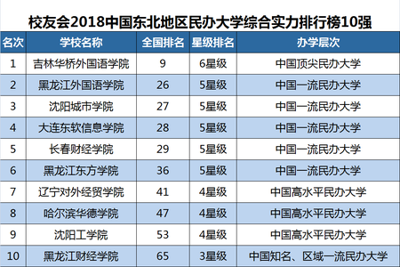 正在最新校友会2018中国平易近办大学排行榜150强中,华桥外国语学院、外国语学院、沈阳城市学院、大连东软消息学院、东方学院、辽宁对外经贸学院、华德学院、沈阳工学院、财院名列校友会2018东北地域平易近办大学分析实力排行榜前10强。