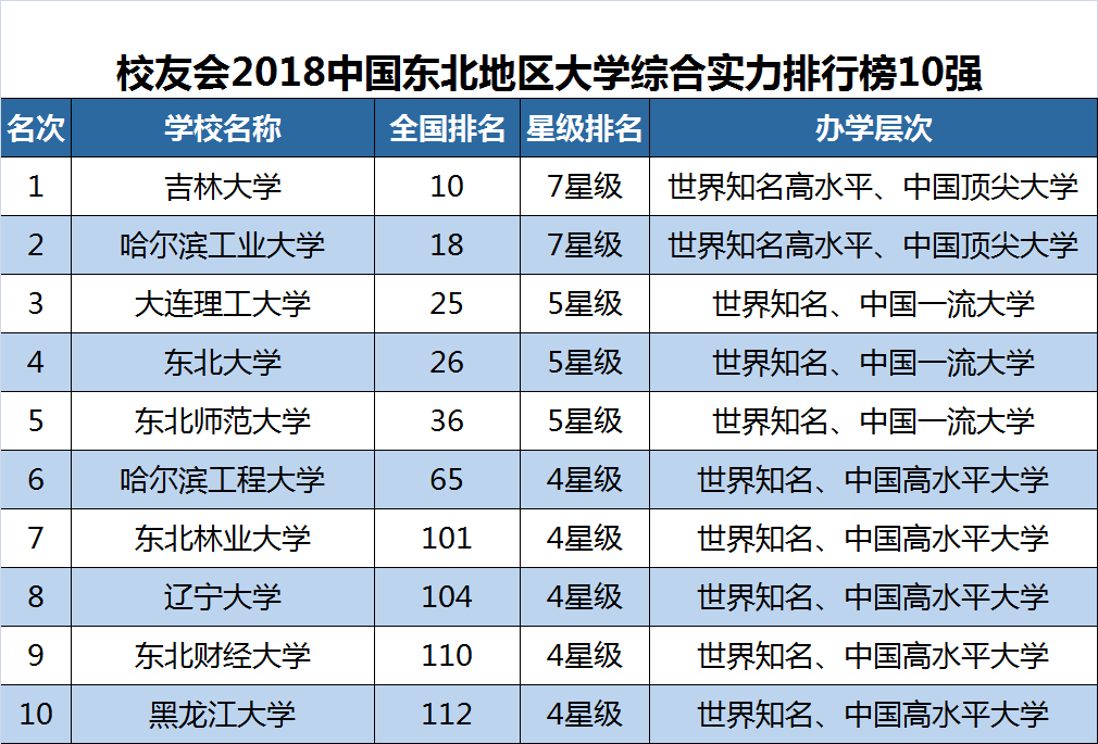 正在最新校友会2018中国大学排行榜700强中,大学、工业大学、大连理工大学、、东北师范大学、工程大学、东北林业大学、辽宁大学、东北财经大学、大学名列校友会2018东北地域大学分析实力排行榜前10强。
