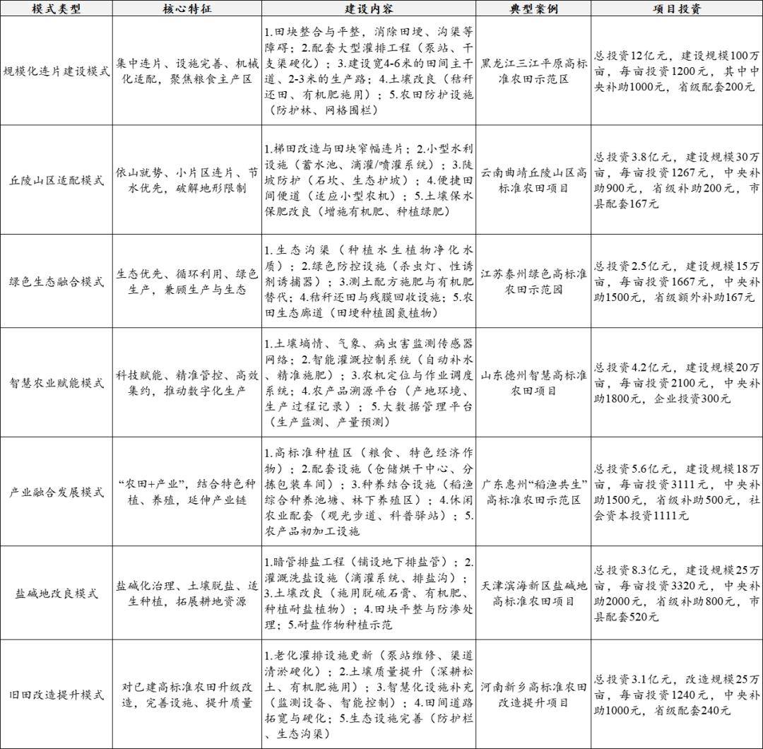 我国高尺度农田扶植立脚分歧区域天然前提、农业出产根本和财产成长需求,构成了多元化的扶植模式,次要包罗“规模化连片扶植模式、丘陵山区适配模式、绿色生态融合模式、聪慧农业赋能模式、财产融合成长模式”等,构成各具特色的典型项目。