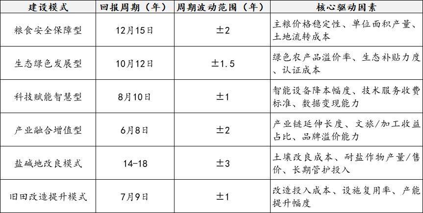 高尺度农田投资报答具有“持久不变、多元收益、社会效益凸起”的特点,报答周期凡是为9-15年。同时高尺度农田投资分歧模式因投资成本、收益布局、政策依赖度分歧,报答周期存正在较着分层;且统一模式下因区域资本禀赋差别,周期波动幅度可达1-3年。连系全国多个典型项目数据,各模式报答周期及焦点驱动要素如下表所示: